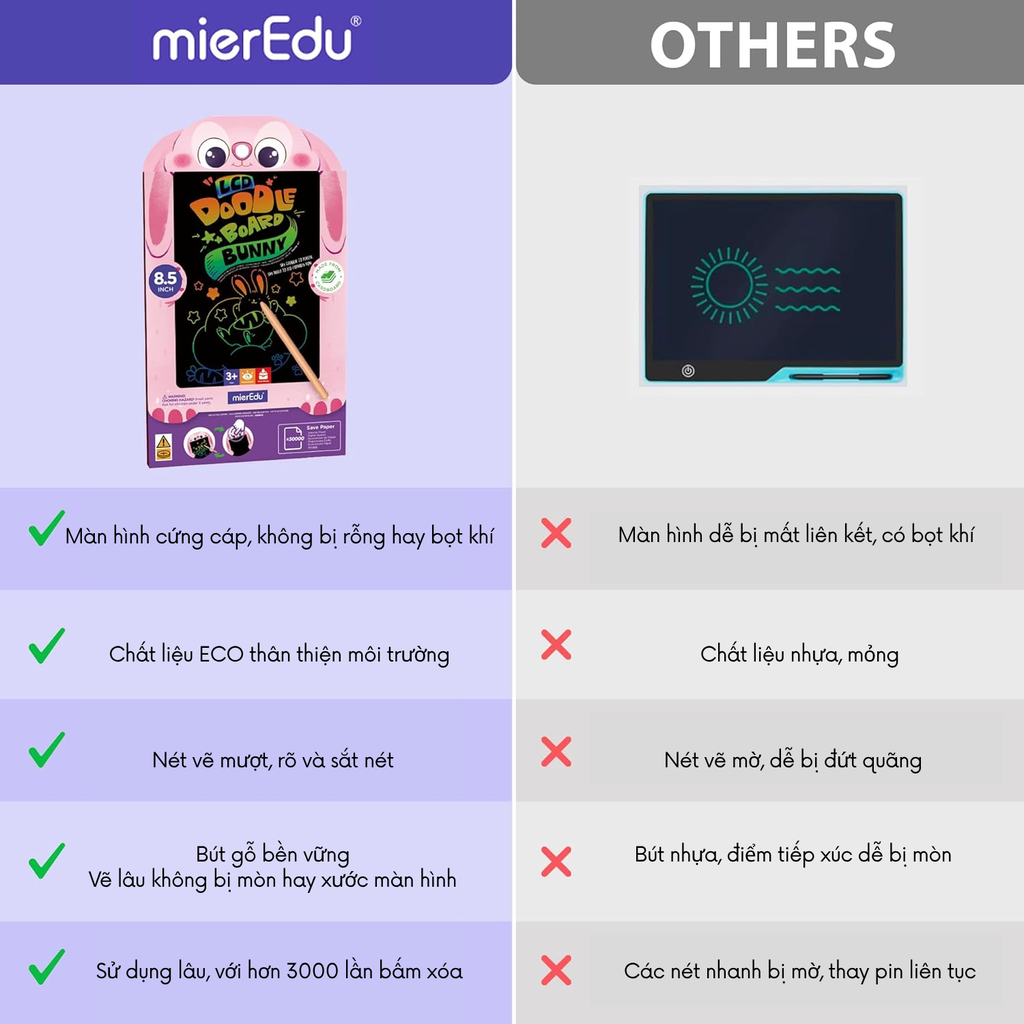 Bảng vẽ xóa LCD mierEdu là sản phẩm sáng tạo lý tưởng dành cho trẻ nhỏ, giúp các em tự do thể hiện trí tưởng tượng thông qua nét vẽ sống động. Với màu sắc rực rỡ và thiết kế nhỏ gọn, bảng không chỉ khơi gợi khả năng sáng tạo mà còn trở thành người bạn đồng hành tiện lợi trong mọi hành trình.