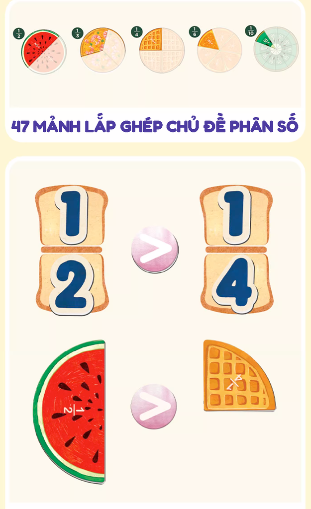 Các miếng ghép mô phỏng trái cây, bánh ngọt và món ăn giúp trẻ hình dung phân số trong thực tế, làm tăng hứng thú và khả năng ghi nhớ lâu dài.