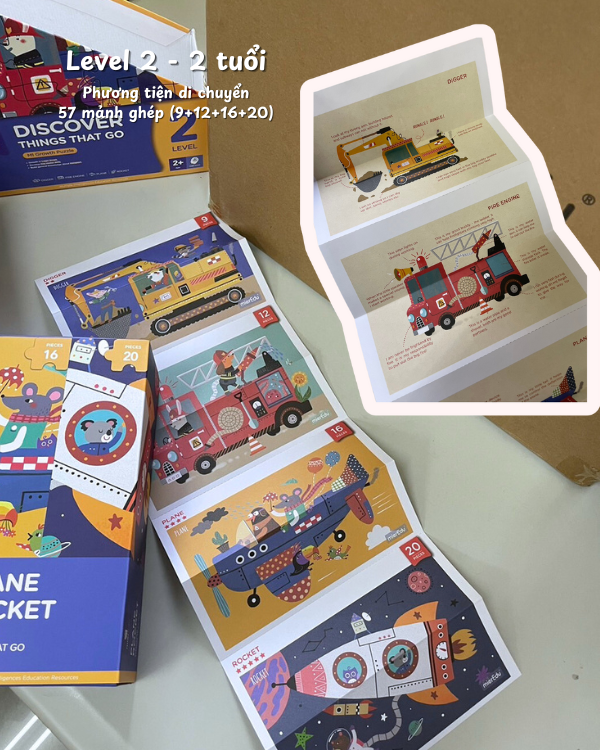 MI Growth Puzzle Level 2 – Discover Things That Go khiến trẻ hào hứng với các phương tiện vận chuyển thú vị: từ máy đào đến tên lửa. Trò chơi không chỉ giúp bé ghép hình mà còn học thêm nhiều thông tin thú vị qua sách hướng dẫn đi kèm, cực kỳ phù hợp để cha mẹ tương tác cùng con.