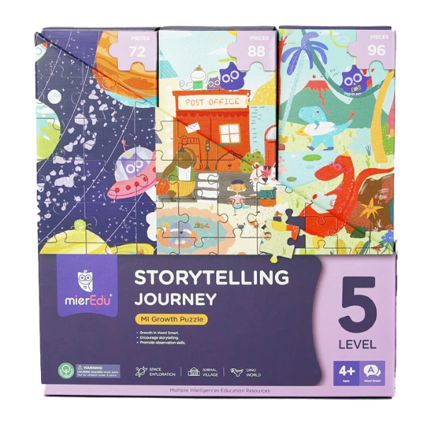 MI Growth Puzzle Level 5 – Storytelling Journey kích thích trí tưởng tượng của trẻ qua các chủ đề hấp dẫn: không gian, làng động vật và thời tiền sử khủng long.