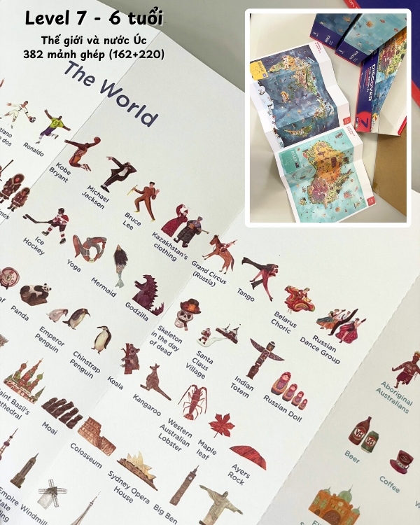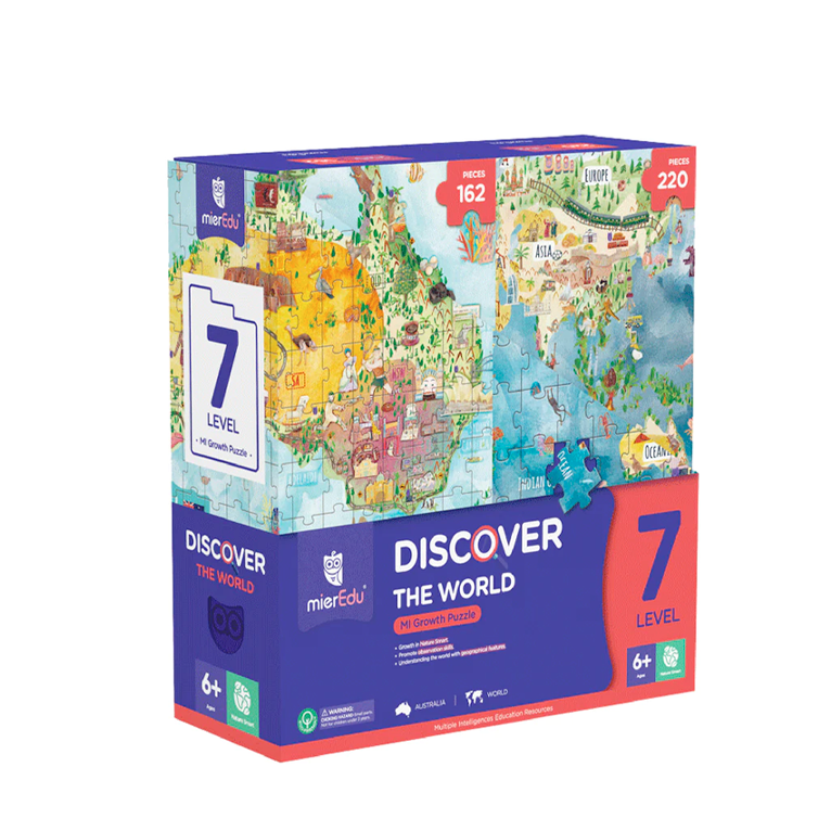 MI Growth Puzzle Level 7 – Discover the World là bước mở rộng toàn diện cho trẻ nhằm khám phá địa lý và văn hóa toàn cầu. Trò chơi bao gồm bản đồ thế giới và bản đồ Úc, kèm chú thích từ ngữ và hình ảnh giúp bé vừa ghép hình vừa học về quốc gia, loài động vật và địa danh nổi bật.