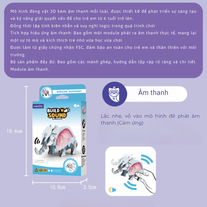 Được làm từ giấy chất lượng cao đạt tiêu chuẩn FSC, sản phẩm không chỉ an toàn mà còn thân thiện với môi trường. Trong quá trình lắp ráp, trẻ sẽ phát triển khả năng tư duy, kiên nhẫn, phối hợp tay – mắt, đồng thời tiếp thu thêm kiến thức thú vị về cấu tạo cơ thể động vật.