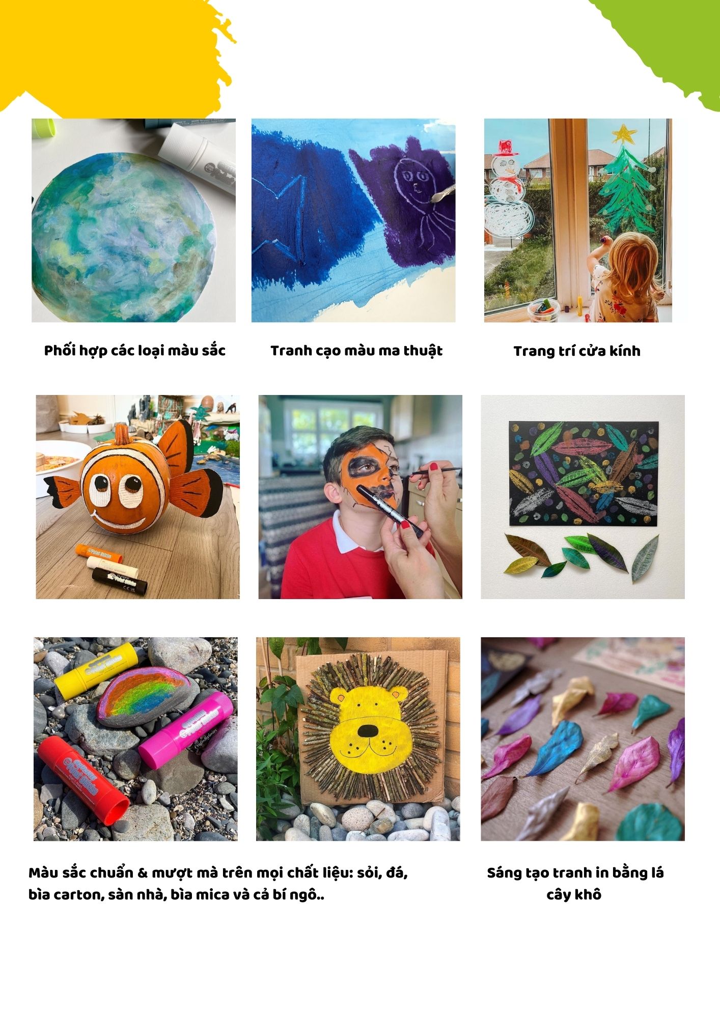- Có thể vẽ lên màu chuẩn mọi chất liệu: giấy, kính, tường, sàn nhà, lá cây, gỗ, quần áo, vải