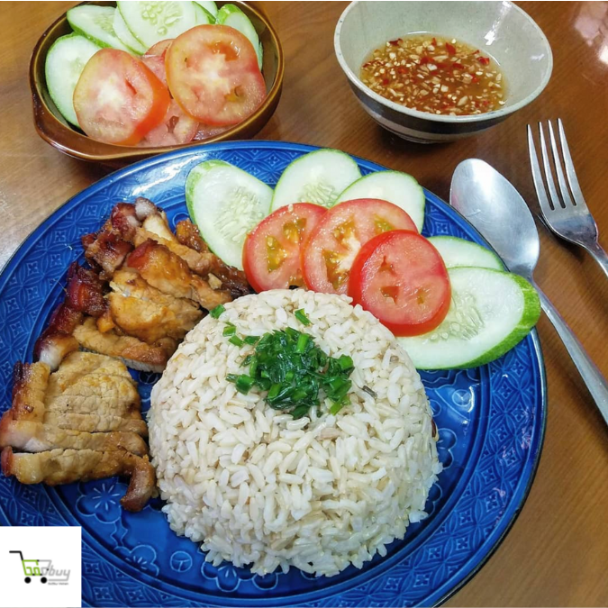 Bày cơm, thịt ra đĩa, rưới lên chút mỡ hành và trang trí cà chua + dưa leo thái mỏng nữa là hoàn thành.