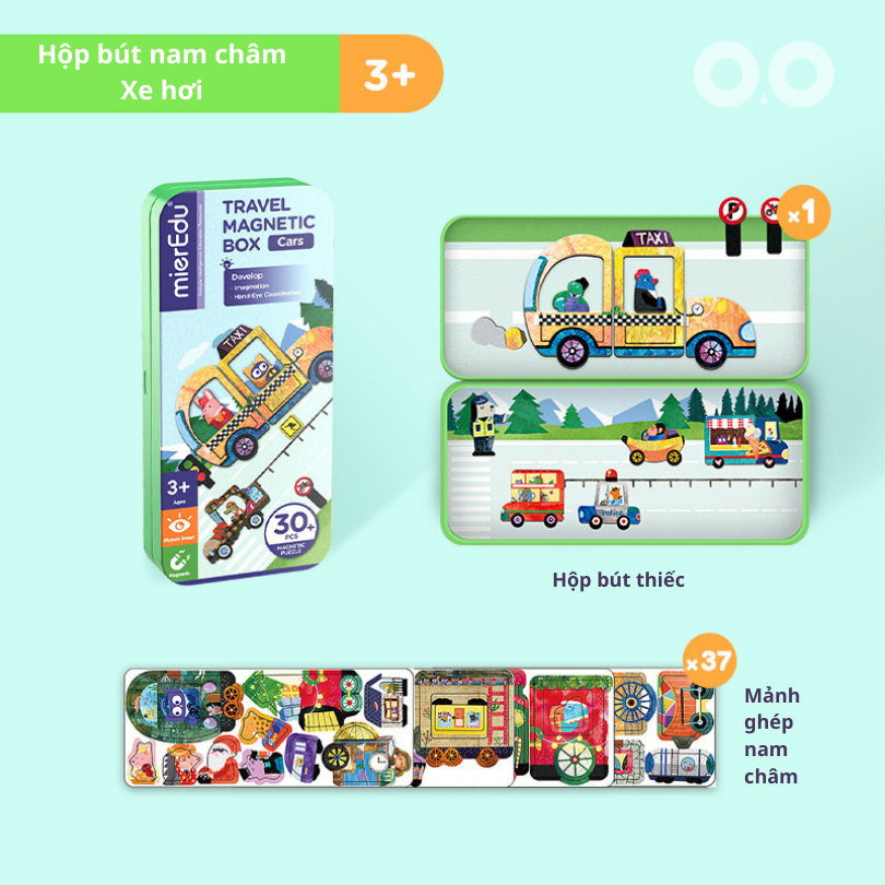 Với hơn 30 mảnh nam châm nhiều màu sắc cùng 2 bối cảnh sinh động, trẻ có thể ghép hình, sắp xếp và tưởng tượng ra những hành trình thú vị – từ bay lên bầu trời đến lướt trên mặt đất.
