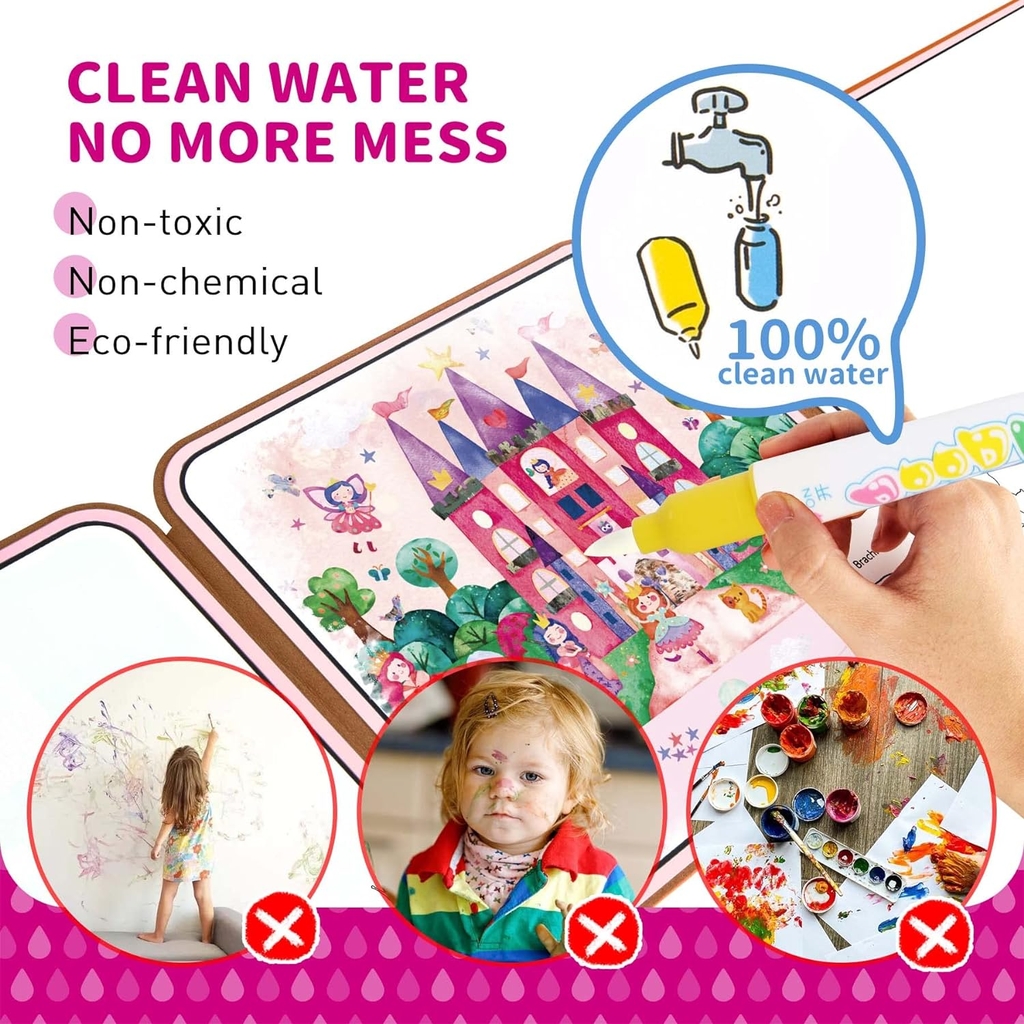 Chỉ cần đổ nước vào bút và vẽ, hình ảnh sẽ hiện lên rồi tự biến mất sau vài phút – không gây lem bẩn, tái sử dụng nhiều lần. Sản phẩm lý tưởng cho việc học và chơi tại nhà, trên ô tô, máy bay hay khi đi du lịch.